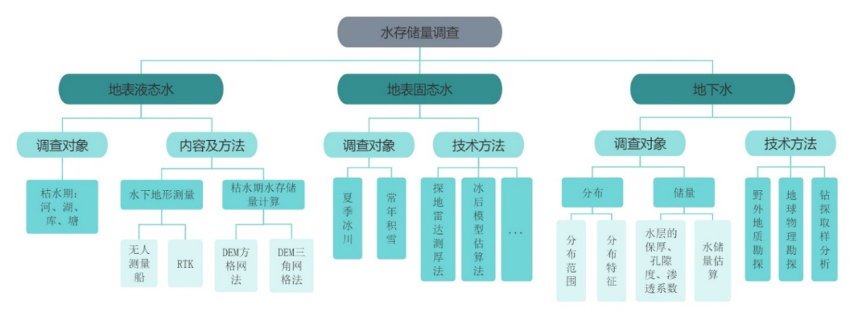 對地表液態(tài)水儲存量、地表固態(tài)水儲存量和地下水儲存量進(jìn)行調(diào)查,調(diào)查對象、內(nèi)容和技術(shù)方法如下圖所示。