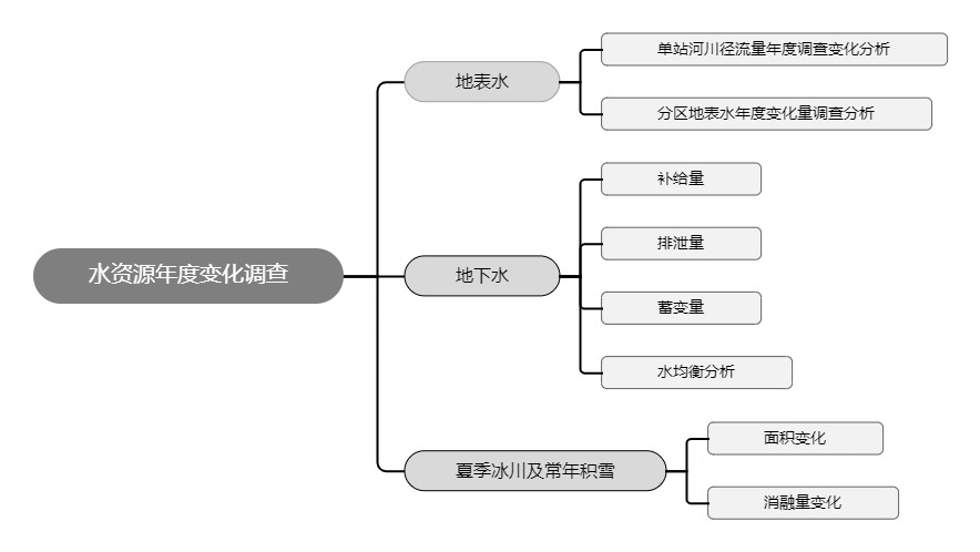 對水資源主要指標(biāo)開展年度變化調(diào)查評價(jià),包括湖泊、水庫和重點(diǎn)江河水體儲存年度變化量,地下水儲存年度變化量,冰川及常年積雪年度面積變化和消融量,河湖庫塘水面面積年度變化等,具體指標(biāo)如下圖所示。