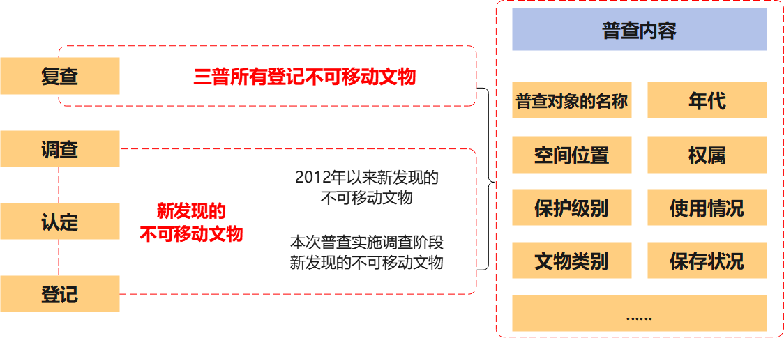 (2)普查對已認定、登記的不可移動文物進行復(fù)查,同時調(diào)查、認定、登記新發(fā)現(xiàn)的不可移動文物。普查的主要內(nèi)容如下: