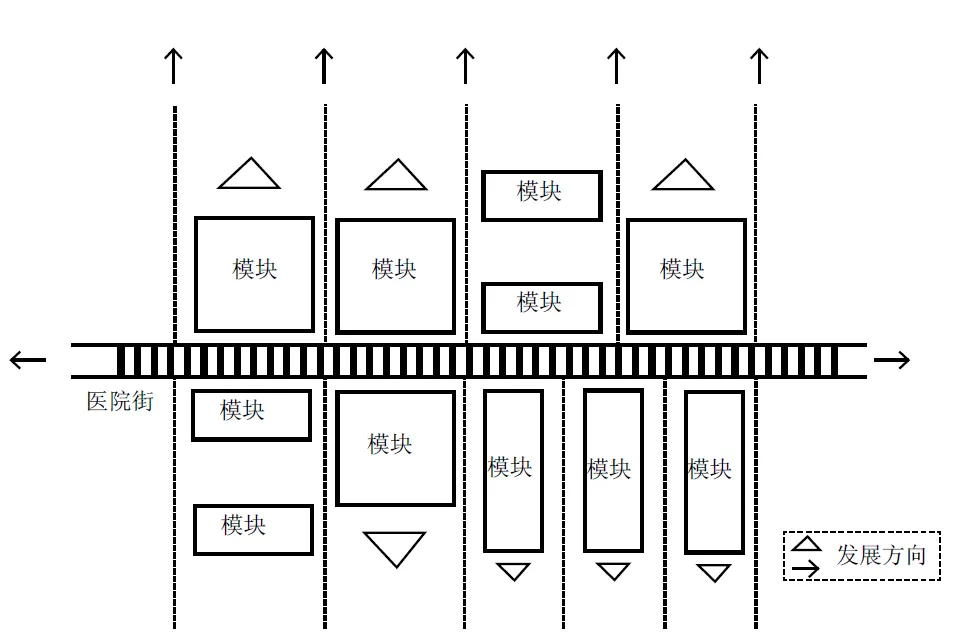 醫(yī)療街模式是現(xiàn)代醫(yī)院建筑設(shè)計(jì)的一種設(shè)計(jì)模式。即在醫(yī)院建筑設(shè)計(jì)中依據(jù)醫(yī)院各功能單元的功能和空間特點(diǎn),把醫(yī)院主體部分的門診、醫(yī)技、住院分散成建筑單體(模塊),再依據(jù)它們之間的功能聯(lián)系,通過一或兩條水平的交通主通道將它們的盡端連接起來。從而使主通道成為醫(yī)院建筑各單元之間的功能和交通聯(lián)系的主動脈和主要公共空間。